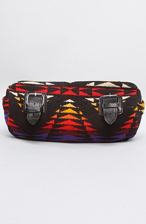 Pendleton The Handlebar Pouch in Black. Native American inspired pouch attaches to the handlebars of a bike with leather buckle closure; top zipper closure; 100% wool.Measures 4" diameter x 10"WBy Pendleton
