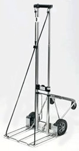 Navigate your way with ease when using the Tri Kart 800. Features include a push-button locking system, tubular polycarbonate handle, 6" roller bearing semi-pneumatic wheels, chrome plated solid steel wheel guards, sliding base lock and wire curb/stair slides. An adjustable lock on permanently attached elastic cords prevents load shifting. Patented rear platform with 3" swivel casters folds down into locked position to function as a 4 wheel dolly. Weight capacity: 300 lbs.